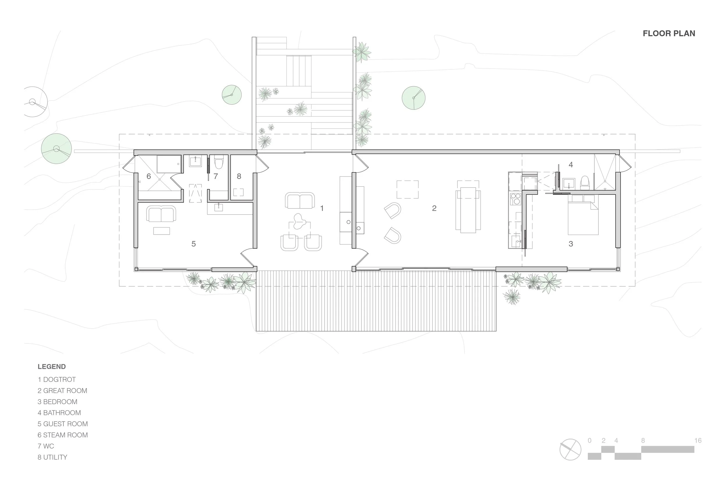The Dry Creek Cabin is sited 2,200 feet above the Columbia River Gorge and the town of White Salmon, Washington. Approached from above, the cabin is dug into the hillside with the roof floating above the landscape, creating an entry portal and presenting a quiet and almost invisible facade to the road. Moving down the concrete entry steps carved into the hillside, one enters a breezeway, or dogtrot, that delineates the two pods of the cabin: the primary living pod to the SE and the guest pod and spa to the NW. Much like moving through the nearby slot canyons, the dogtrot frames the views of the Gorge below and Mt. Hood beyond and provides refuge and protection from the ever-present Gorge winds in winter, while allowing the cooling summer breezes to pass through.